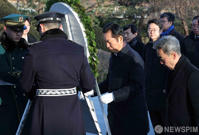 [서울=뉴스핌] 윤창빈 기자 = 정청래 더불어민주당 대표가 1일 오전 서울 동작구 국립서울현충원에서 2026 신년 참배를 하며 헌화하고 있다. 2026.01.01 pangbin@newspim.com