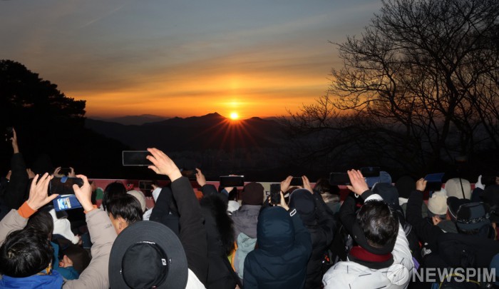 [서울=뉴스핌] 2026년 ‘붉은 말의 해’ 병오년(丙午年) 첫날인 1일 서울 도봉산 천축사에서 도봉구청(구청장 오언석)이 주최한 해맞이 행사에서 500여 명의 구민들이 일출사진을 촬영하고 있다. [사진=도봉구청] 2026.01.01 photo@newspim.com