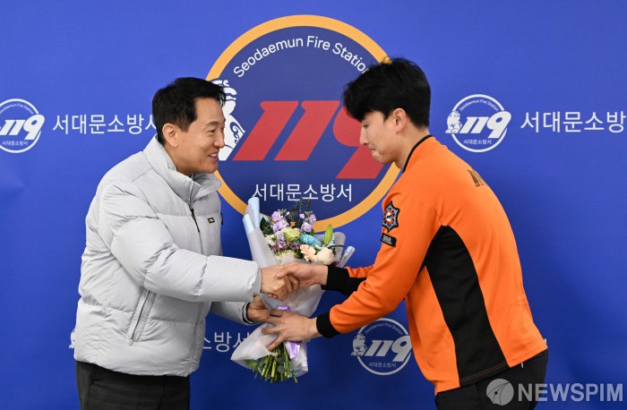 [서울=뉴스핌] 오세훈 서울시장이 병오년 첫날인 1일 서대문소방서를 찾아 휴무일 성산대교 차량 화재를 초기 진압한 김정현 소방교에게 격려와 감사를 전하며 꽃다발을 전달하고 있다. [사진=서울시청] 2026.01.01 photo@newspim.com