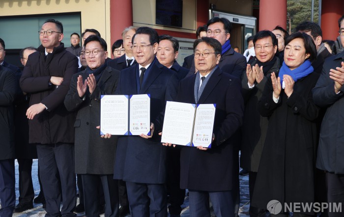 [광주=뉴스핌] 박진형 기자 = 강기정 광주시장과 김영록 전남도지사가 2일 국립5·18민주묘지에서 '통합 지방정부 추진 공동선언문'을 발표한 뒤 기념사진을 촬영하고 있다. 2026.01.02 bless4ya@newspim.com