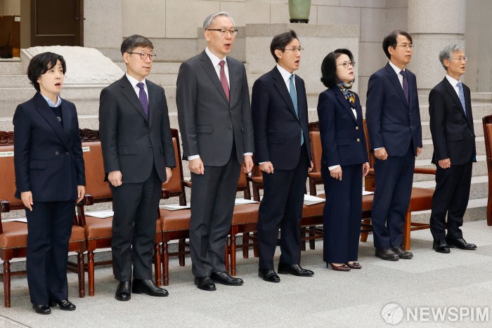 [서울=뉴스핌] 류기찬 기자 = 조희대 대법원장을 비롯한 참석자들이 2일 오전 서울 서초구 대법원에서 열린 시무식에서 애국가를 제창하고 있다. 2026.01.02 ryuchan0925@newspim.com