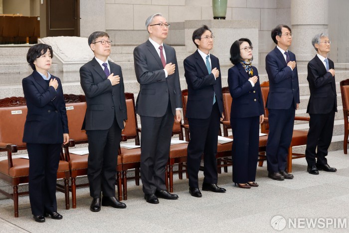 [서울=뉴스핌] 류기찬 기자 = 조희대 대법원장을 비롯한 참석자들이 2일 오전 서울 서초구 대법원에서 열린 시무식에서 국민의례를 하고 있다. 2026.01.02 ryuchan0925@newspim.com