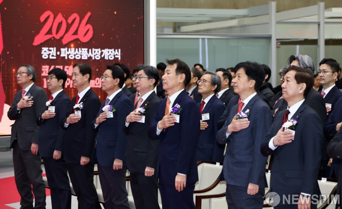 [서울=뉴스핌] 최지환 기자 = 정은보 한국거래소 이사장을 비롯한 참석자들이 2일 오전 서울 영등포구 한국거래소 서울사무소에서 열린 2026년도 증권·파생상품시장 개장식에서 국민의례를 하고 있다. 2026.01.02 choipix16@newspim.com