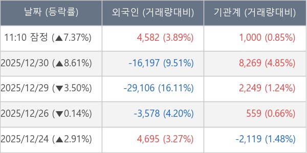 [장중수급포착] 비나텍, 외국인/기관 동시 순매수… 주가 +7.37%