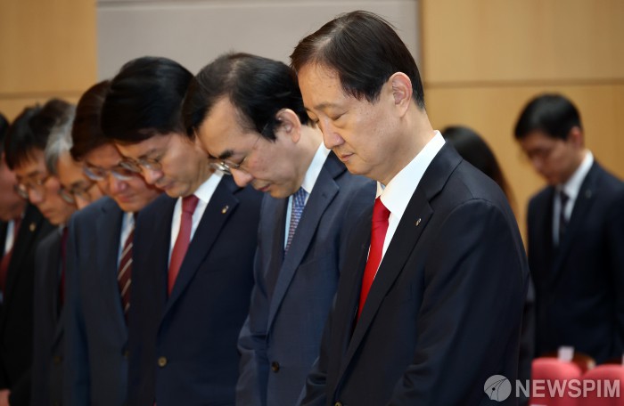 [서울=뉴스핌] 최지환 기자 = 이찬진 금융감독원장이 2일 오전 서울 영등포구 금융감독원에서 열린 금융감독원 시무식에서 묵념을 하고 있다. 2026.01.02 choipix16@newspim.com