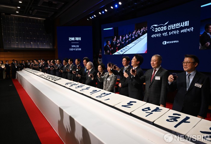 [서울=뉴스핌] 사진공동취재단 = 김민석 국무총리를 비롯한 경제계 인사들이 2일 오후 서울 중구 대한상공회의소 국제회의장에서 열린 ‘2026 경제계 신년인사회’에서 떡케이크 커팅을 하고 있다. 2026.01.02 photo@newspim.com