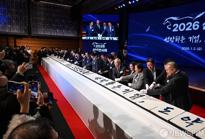 [서울=뉴스핌] 사진공동취재단 = 김민석 국무총리를 비롯한 경제계 인사들이 2일 오후 서울 중구 대한상공회의소 국제회의장에서 열린 ‘2026 경제계 신년인사회’에서 떡케이크 커팅을 하고 있다. 2026.01.02 photo@newspim.com