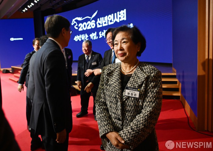 [서울=뉴스핌] 사진공동취재단 = 현정은 현대그룹 회장이 2일 오후 서울 중구 대한상공회의소 국제회의장에서 열린 ‘2026 경제계 신년인사회’에서 참석자들과 인사를 하고 있다. 2026.01.02 photo@newspim.com