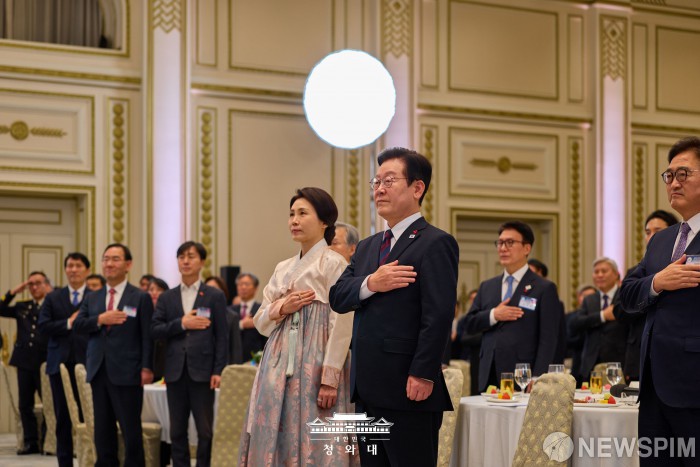 [서울=뉴스핌] 이재명 대통령이 2일 서울 종로구 청와대 영빈관에서 열린 2026년 신년인사회에서 국기에 대한 경례를 하고 있다. [사진=청와대] 2026.01.02 photo@newspim.com