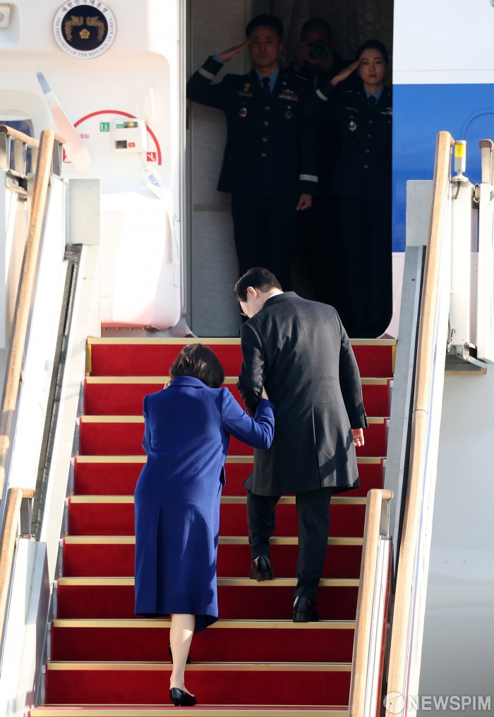 김혜경 여사 부축하며 공군 1호기 오르는 이재명 대통령