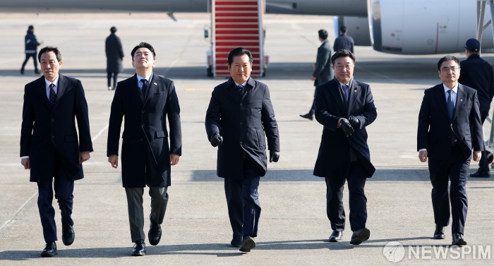 [성남=뉴스핌] 정일구 기자 = 우상호 청와대 정무수석(왼쪽부터), 강훈식 대통령비서실장, 정청래 더불어민주당 대표, 윤호중 행정안전부 장관, 팡쿤 주한 중국대사대리가 4일 오후 경기 성남시 서울공항에서 중국을 국빈 방문하는 이재명 대통령과 김혜경 여사를 환송한 뒤 이동하고 있다. 2026.01.04 mironj19@newspim.com