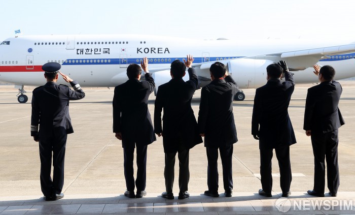 [성남=뉴스핌] 정일구 기자 = 우상호 청와대 정무수석(왼쪽 두번째부터), 강훈식 대통령비서실장, 정청래 더불어민주당 대표, 윤호중 행정안전부 장관, 팡쿤 주한 중국대사대리가 4일 오후 경기 성남시 서울공항에서 중국을 국빈 방문하는 이재명 대통령과 김혜경 여사가 탑승한 공군 1호기를 향해 손을 흔들고 있다. 2026.01.04 mironj19@newspim.com