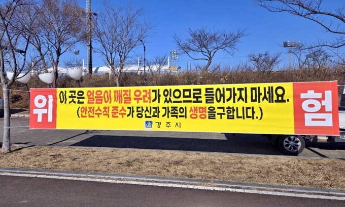 경주시는 결빙 구간을 중심으로 얼음썰매 이용 금지와 출입 자제를 알리는 안전 홍보 현수막을 게시했다.