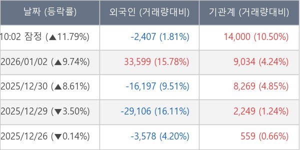 [장중수급포착] 비나텍, 기관 5일 연속 순매수행진... 주가 +11.79%