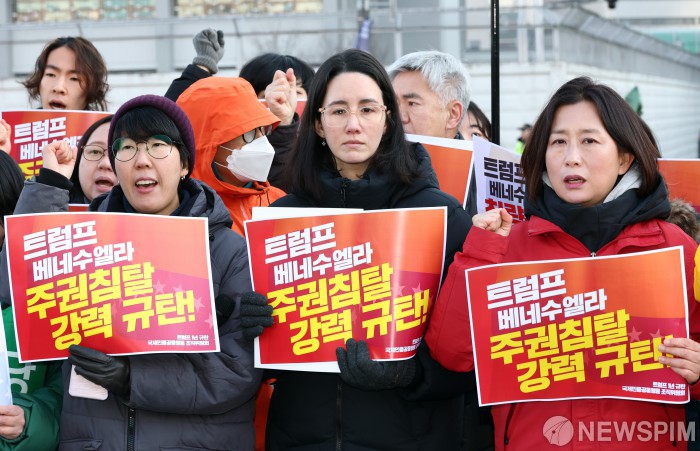 [서울=뉴스핌] 최지환 기자 = 5일 오전 서울 종로구 주한미국대사관 앞에서 열린 '트럼프 베네수엘라 침공 규탄 국제민중행동 긴급 기자회견'에서 나타샤 파리아 페르난데스 베네수엘라 대사대리를 비롯한 참석자들이 구호를 외치고 있다. 2026.01.05 choipix16@newspim.com
