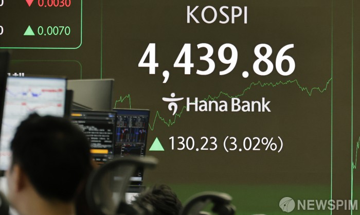 [서울=뉴스핌] 양윤모 기자 = 5일 오후 코스피가 전장 종가보다 130.23 포인트(3.02%) 상승하며 4439.86으로, 코스닥은 9.91 포인트(1.05%) 상승한 955.48로 거래되는 가운데, 서울 중구 하나은행 딜링룸에서 직원들이 업무를 보고 있다. 서울외환시장에서 달러/원 환율은 전장 대비 5.40원 상승한 1447.20원에 거래되고 있다. 2026.01.05 yym58@newspim.com