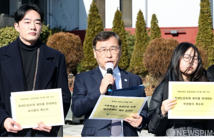[서울=뉴스핌] 최지환 기자 = 정근식 서울시교육감이 5일 오후 서울 중구 서울시의회 본관 앞에서 학생인권조례 폐지 관련 재의요구 입장문을 발표하고 있다. 2026.01.05 choipix16@newspim.com