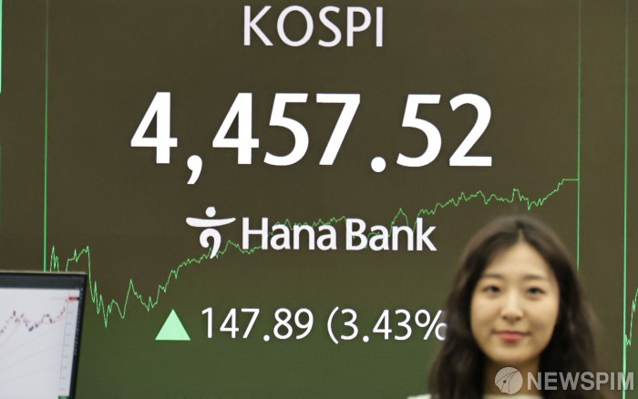 [서울=뉴스핌] 양윤모 기자 = 5일 오후 코스피가 전장 종가보다 147.89 포인트(3.43%) 상승하며 4457.52로, 코스닥은 11.93 포인트(1.26%) 상승한 957.50으로 장을 마감한 가운데, 서울 중구 하나은행 딜링룸에서 직원들이 업무를 보고 있다. 서울외환시장에서 달러/원 환율은 전장 대비 2.30원 상승한 1444.10원에 주간거래를 마감했다. 2026.01.05 yym58@newspim.com