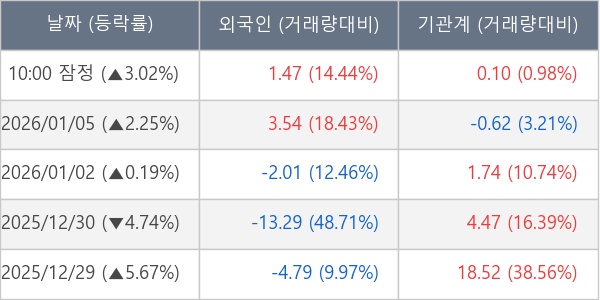 [서울=뉴스핌] 로보뉴스 = 06일 10시 15분 현재 풍산(103140)은 외국인과 기관이 각각 1.47 만 주, 0.10 만 주 순매수(잠정) 하면서 전일 대비 3.02% (현재가 112,400원) 상승하고 있다.