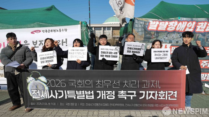 [서울=뉴스핌] 윤창빈 기자 = 전세사기·깡통전세 피해자 전국대책위원회등 시민단체들이 6일 서울 여의도 국회 정문 앞에서 열린 전세사기특별법 개정 촉구 기자회견에서 피켓을 들고 있다. 2026.01.06 pangbin@newspim.com