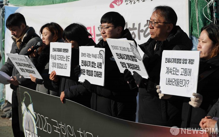 [서울=뉴스핌] 윤창빈 기자 = 전세사기·깡통전세 피해자 전국대책위원회등 시민단체들이 6일 서울 여의도 국회 정문 앞에서 열린 전세사기특별법 개정 촉구 기자회견에서 피켓을 들고 있다. 2026.01.06 pangbin@newspim.com