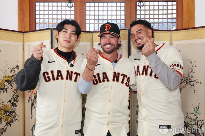[서울=뉴스핌] 류기찬 기자 = 미국프로야구 메이저리그(MLB) 샌프란시스코 자이언츠의 이정후(왼쪽)가 6일 오후 서울 종로구 클래식고택 디토에서 한국 문화 체험에 앞서 토니 바이텔로 감독(가운데), 윌리 아다메스와 기념촬영을 하고 있다. 2026.01.06 ryuchan0925@newspim.com
