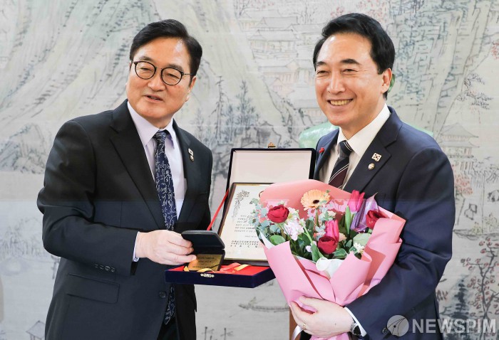[서울=뉴스핌] 윤창빈 기자 = 박수현 더불어민주당 의원이 6일 서울 여의도 국회에서 열린 백봉신사상 시상식에서 우원식 국회의장으로부터 상패를 받고 있다. 2026.01.06 pangbin@newspim.com