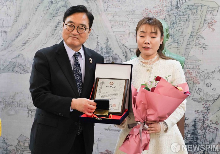 [서울=뉴스핌] 윤창빈 기자 = 김예지 국민의힘 의원이 6일 서울 여의도 국회에서 열린 백봉신사상 시상식에서 우원식 국회의장으로부터 상패를 받고 있다. 2026.01.06 pangbin@newspim.com