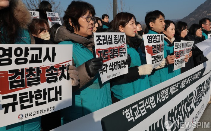 [서울=뉴스핌] 이길동 기자 = 전국교직원노동조합 관계자들이 7일 서울 종로구 정부서울청사 앞에서 '학교급식법 시행령' 개정 촉구 기자회견을 하고 있다. 2026.01.07 gdlee@newspim.com
