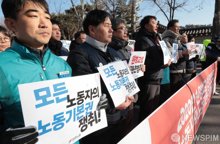 [서울=뉴스핌] 이길동 기자 = 양경수 민주노총 위원장이 7일 서울 종로구 청와대 앞에서 열린 '원청교섭 원년 선포! 모든 노동자의 노동기본권 쟁취! 2026년 민주노총 신년 기자회견'에서 발언하고 있다. 2026.01.07 gdlee@newspim.com