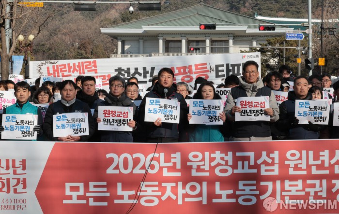 [서울=뉴스핌] 이길동 기자 = 양경수 민주노총 위원장이 7일 서울 종로구 청와대 앞에서 열린 '원청교섭 원년 선포! 모든 노동자의 노동기본권 쟁취! 2026년 민주노총 신년 기자회견'에서 발언하고 있다. 2026.01.07 gdlee@newspim.com
