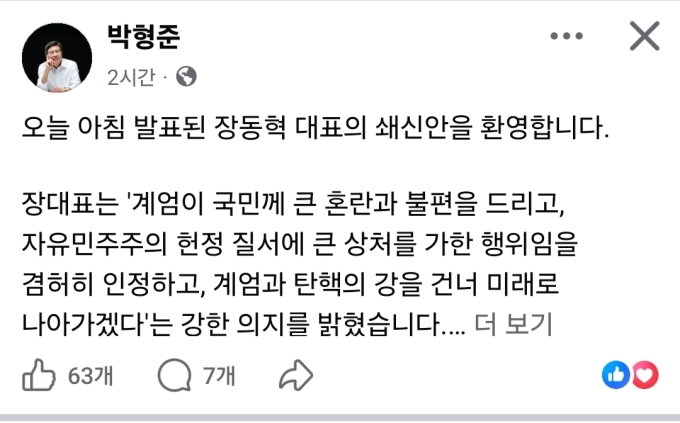 박 시장은 이날 오전 페이스북에 적은 글을 통해 "오늘 아침 발표된 장동혁 대표의 쇄신안을 환영한다"며 "장 대표가 계엄 사태로 국민께 혼란과 불편을 드린 점을 인정하고, 자유민주주의 헌정 질서의 회복과 미래로의 도약을 다짐한 것은 보수의 가치를 바로 세우려는 결단"이라고 평가했다.