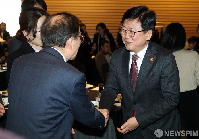 [서울=뉴스핌] 정일구 기자 = 최교진 교육부 장관이 7일 오후 서울 영등포구 FKI타워 컨퍼런스센터에서 열린 2026년 교육계 신년교례회에서 참석자들과 인사하고 있다. 2026.01.07 mironj19@newspim.com