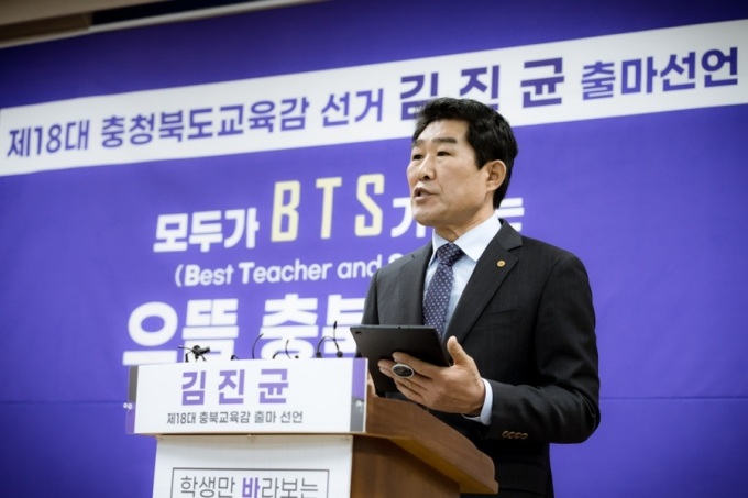 [청주=뉴스핌] 백운학 기자 = 김진균 청주시체육회장이 "33년 현장 교육 경험을 바탕으로 무너진 충북 교육을 바로 세우겠다"며 제19대 충북도교육감 선거 출마를 공식 선언했다.