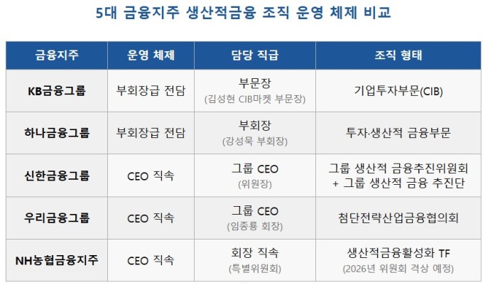 하나금융과 KB금융그룹은 그룹의 2인자인 부회장급 인사가 전담하고, 신한·우리·농협금융그룹은 그룹의 CEO가 직접 생산적 금융을 취급하며 그룹 차원의 생산적 금융 관련 전략과 집행을 공유하게 했다.