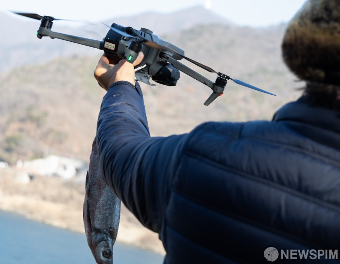 [남양주=뉴스핌] 류기찬 기자 = 7일 오전 경기 남양주시 와부읍 팔당댐 인근 상수원보호구역에서 일부 몰지각한 아마추어 사진가가 멸종위기 야생생물 I급으로 지정된 참수리의 물고기 사냥 장면을 근접 촬영하기 위해 냉동 물고기를 드론을 이용해 한강에 투척하고 있다. 참수리는 전 세계의 약 4000여 마리밖에 남지 않은 희귀 겨울 철새로, 국내에는 팔당댐 인근에 매년 1~3마리가 정기 도래하고 있다. 2026.01.07 ryuchan0925@newspim.com