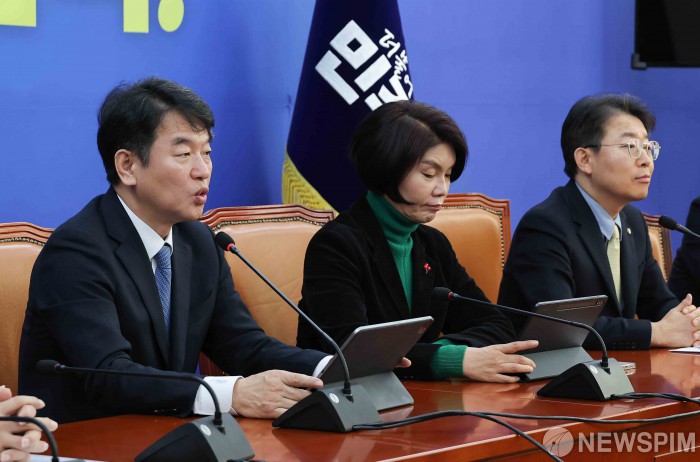[서울=뉴스핌] 윤창빈 기자 = 문진석 더불어민주당 원내대표 직무대행이 8일 서울 여의도 국회에서 열린 정책조정회의에서 모두발언을 하고 있다. 2026.01.08 pangbin@newspim.com