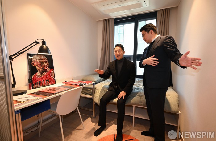 [서울=뉴스핌] 양윤모 기자 = 오세훈 서울시장이 8일 오전 기업형 민간임대주택인 서울 마포구 '맹그로브 신촌'을 방문해 조강태 MGRV 대표의 안내로 현장점검을 하고 있다. [공동취재] 2026.01.08 yym58@newspim.com