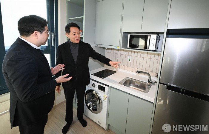 [서울=뉴스핌] 양윤모 기자 = 오세훈 서울시장이 8일 오전 기업형 민간임대주택인 서울 마포구 '맹그로브 신촌'을 방문해 조강태 MGRV 대표의 안내로 현장점검을 하고 있다. [공동취재] 2026.01.08 yym58@newspim.com
