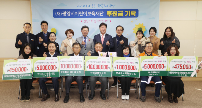 기탁에는 ▲㈜범양해무공사와 합자회사 여진해운사 각 1000만 원▲㈜금홍기업과 ㈜아쿠아텍 각 500만 원▲한국교육지원연구소 100만 원▲해맑은어린이집 60만 원▲광양한라비발디센트럴마크 어린이집 47만5000원▲광양푸르지오더센트럴 어린이집 45만 원이 참여했다.