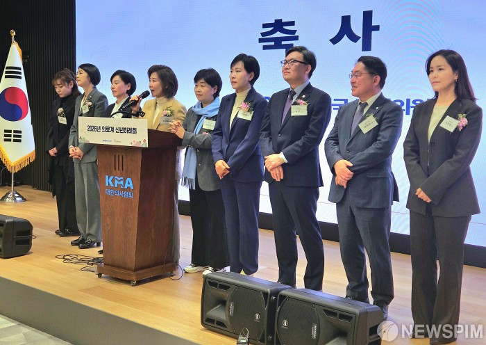 [서울=뉴스핌] 여야 국회의원들이 8일 오전 서울 용산구 대한의사협회 회관에서 열린 2026년 의료계 신년하례회에서 축사를 하고 있다. 왼쪽부터 국민의힘 김예지, 한지아, 서명옥, 나경원 의원, 더불어민주당 서영교, 전현희, 김윤, 박희승 의원, 개혁신당 이주영 의원. [사진=대한의사협회] 2026.01.08 photo@newspim.com