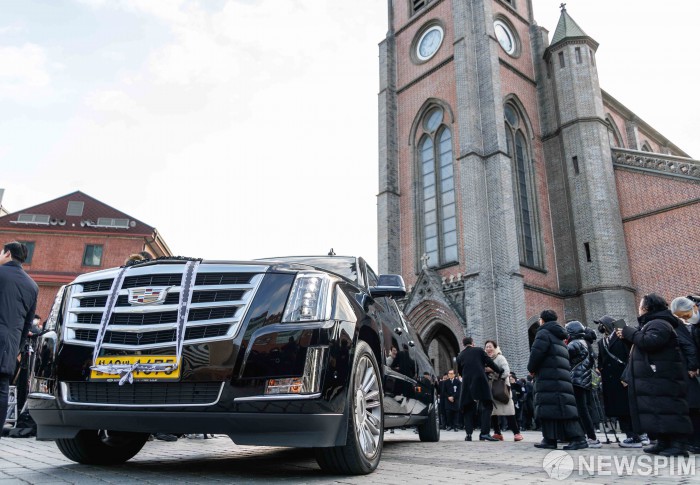 [서울=뉴스핌] 윤창빈 기자 = 배우 고(故) 안성기의 영결식이 엄수된 9일 서울 중구 명동성당에서 장례미사를 마친 고인의 운구를 실은 차량이 성당을 나서고 있다. 2026.01.09 pangbin@newspim.com