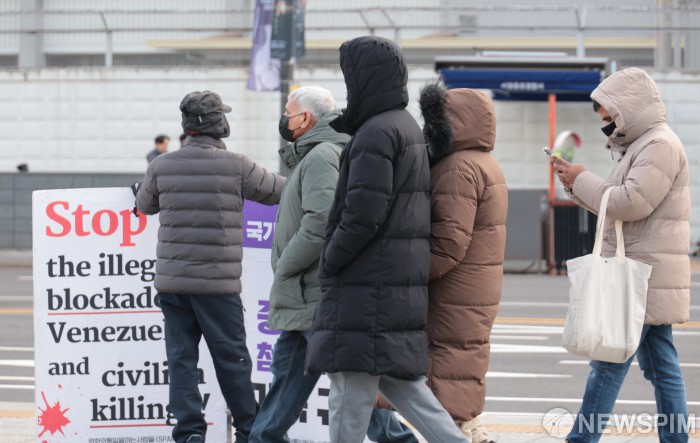 [서울=뉴스핌] 이길동 기자=연이틀 전국 대부분 지역이 영하권 추위를 보인 9일 오전, 서울 종로구 광화문네거리에서 두꺼운 외투를 입은 관광객들이 발걸음을 옮기고 있다. 2026. 01. 09. gdlee@newspim.com