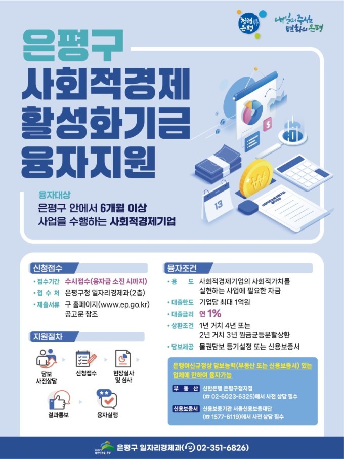 [서울=뉴스핌] 백승은 기자 = 서울 은평구는 사회적경제기업의 성장과 경영 안정을 돕기 위해 사회적경제활성화기금 융자 지원사업을 실시한다고 9일 밝혔다.