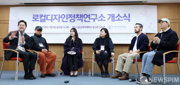 [서울=뉴스핌] 정일구 기자 = 9일 오후 서울 성북구 성신여자대학교 성신관에서 열린 로컬디자인정책연구소 개소식에서 패널들이 북토크·대담 및 지정토론을 하고 있다. 왼쪽부터 오정현 시너지타워 부사장, 김종석 에이티쿠움파트너스 대표, 채지민 성신여대 교수, 신지혜 STS개발 상무, 박상현 존앤마크 대표, 황윤민 무월에프앤비·로프컴퍼니 대표. 2026.01.09 mironj19@newspim.com