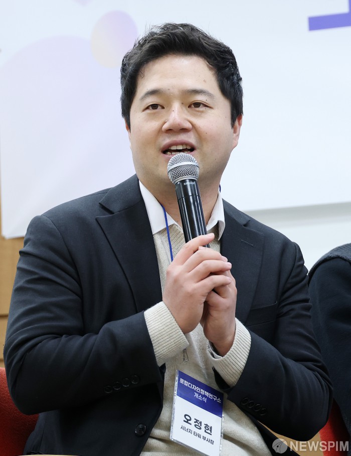 [서울=뉴스핌] 정일구 기자 = 오정현 시너지타워 부사장이 9일 오후 서울 성북구 성신여자대학교 성신관에서 열린 로컬디자인정책연구소 개소식에서 북토크·대담 및 지정토론을 하고 있다. 2026.01.09 mironj19@newspim.com