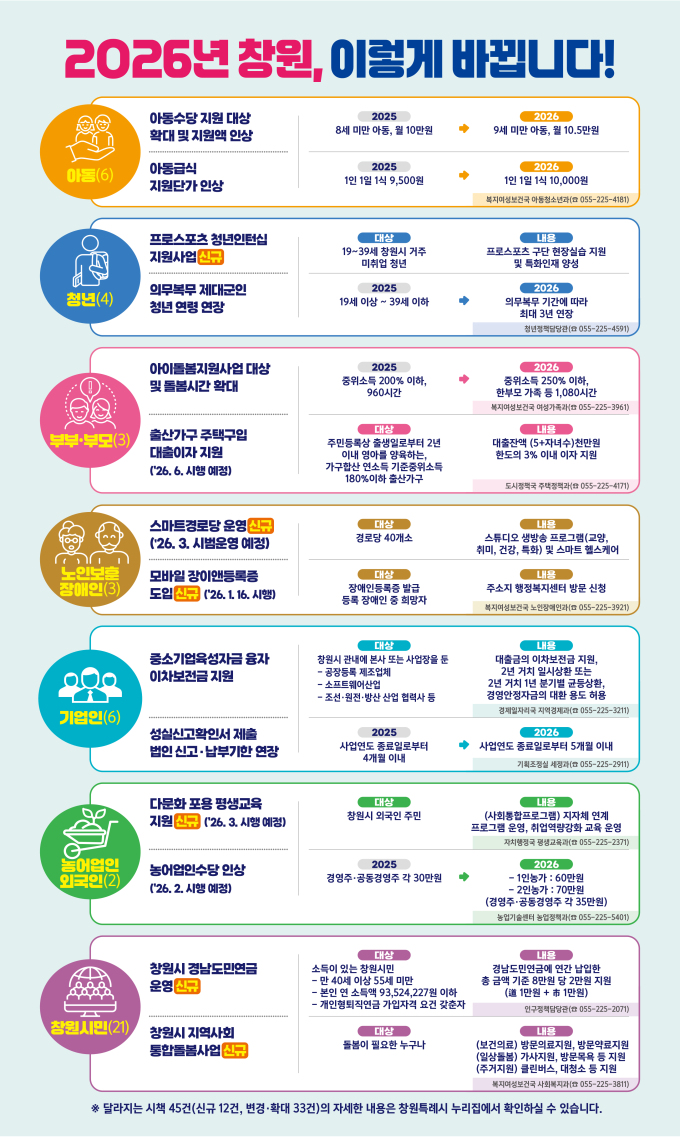 [창원=뉴스핌] 남경문 기자 = 경남 창원시는 2026년부터 새롭게 시행되거나 확대·변경되는 주요 시책을 정리한 '2026년 달라지는 시책' 책자(전자책 포함)를 발간했다고 9일 밝혔다.