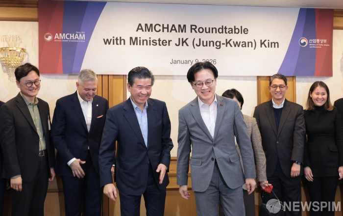 [서울=뉴스핌] 이길동 기자 = 김정관 산업통상부 장관(왼쪽에서 네번째)이 9일 서울 종로구 정부서울청사에서 주한미상공회의소 초정 간담회에서 제임스 김 암참회장(왼쪽에서 세번째)과 기념촬영을 마친 후 자리로 향하고 있다. 2026.01.09 gdlee@newspim.com