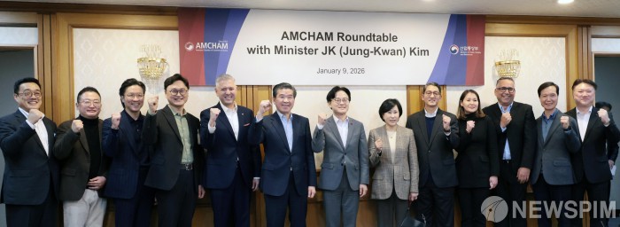 [서울=뉴스핌] 이길동 기자 = 김정관 산업통상부 장관(왼쪽에서 일곱번째)이 9일 서울 종로구 정부서울청사에서 주한미상공회의소 초정 간담회에서 제임스 김 암참 회장(왼쪽에서 여섯번째)등 참석자들과 기념촬영을 하고 있다. 2026.01.09 gdlee@newspim.com