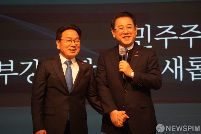[광주=뉴스핌] 박진형 기자 = 11일 오후 광주 서구 김대중컨벤션센터 컨벤션홀에서 열린 강기정 광주시장의 출판기념회 '광주, 처음보다 더 극적인 두 번째 등장'에서 김영록(오른쪽) 전남지사가 축사를 하고 있다. 2026.01.11 bless4ya@newspim.com